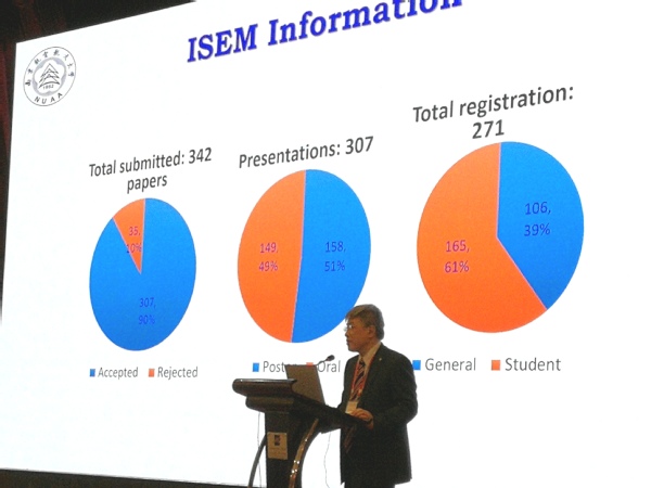 为期三天的大会期间,与会代表们围绕大会主题在五个分会场对电磁学和力学应用新技术进行了广泛的交流和研讨,内容涵盖电磁功能材料与自适应系统,电磁智能流体,材料的电磁加工,动力学及控制,无损检测和高级信号处理,微机电系统,电磁传感器和执行器等领域。会议期间代表们还参观了南京航空航天馆。在会议宴会期间,大会还评选出了6篇最佳海报,并颁发了相应证书和奖金。