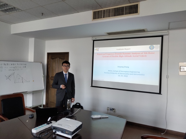 bevictor伟德官网航空航天交叉研究院(IRIAA)张夏阳博士于2019年10月24日为公司师生做了题为“Report on frequency-domain dynamic analyses of tilt-rotor systems of flexible high-altitude aerial vehicle”的学术报告。报告针对近年来矢量推进技术在新型高空飞艇中的运用难点,对矢量推力技术对提高飞艇飞行能力的重要性进行了阐述,并针对矢量推进系统的动力学特性分析等内容,开展了系统动力学建模、数值求解和参数影响分析的介绍与分析工作。