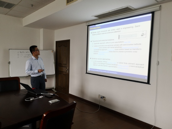 bevictor伟德官网航空航天交叉研究院(IRIAA)徐亮博士于6月19日为公司师生做了题为“On the solutions to the Saint-Venantproblem of heterogeneous beam-like structures with periodic microstructures”的学术报告。报告针对具有周期微结构的非均质多孔梁结构的Saint-Venant问题,介绍了多孔周期梁结构Saint-Venant问题的求解方法,周期梁结构的渐近均匀化方法及其有限元数值实现。报告结束后,徐亮博士与在场的师生就相关领域的研究进行了交流和讨论。宿柱老师主持了报告会。
