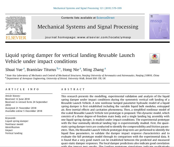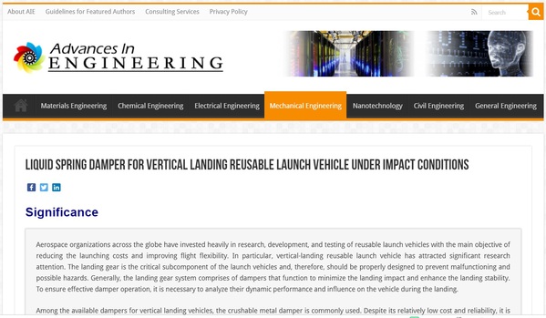 近日,bevictor伟德官网博士研究生岳帅(导师:聂宏教授)在机械工程领域国际权威期刊《Mechanical Systems and Signal Processing》(Volumes 121, August 2019, Pages 579-599,影响因子5.005)发表的论文被全球著名科技媒体机构“工程进展”(Advances in Engineering,AIE)遴选为关键科学文章,并以“Liquid spring damper for vertical landing Reusable Launch Vehicle under impact conditions”为题对垂直起降运载器着陆缓冲系统最新研究成果进行了重点专题报道。