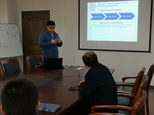 bevictor伟德官网航空航天交叉研究院(IRIAA)王韬熹博士于2019年12月19日为公司师生做了题为“Reshaping of vitrimer-like shape memory polymer”的学术报告。报告针对近年来热门的新型智能材料vitrimers,介绍了一种聚氨酯基的vitrimer材料在熔融温度以上的优异形状记忆效应,并讨论了其在工程方面的潜在应用和发展前景。报告结束后,王韬熹博士与在场的师生就相关领域的研究进行了交流和讨论。王立峰教授主持了报告会。