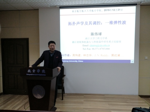 应bevictor伟德官网机械结构力学及控制国家重点实验室高存法教授邀请,浙江大学航空航天学院工程力学系、长江学者、国家杰青陈伟球教授于2019年12月30日至31日访问公司,并于12月31日为公司师生做了题为“拓扑声学及其调控:一维弹性波”的学术报告。