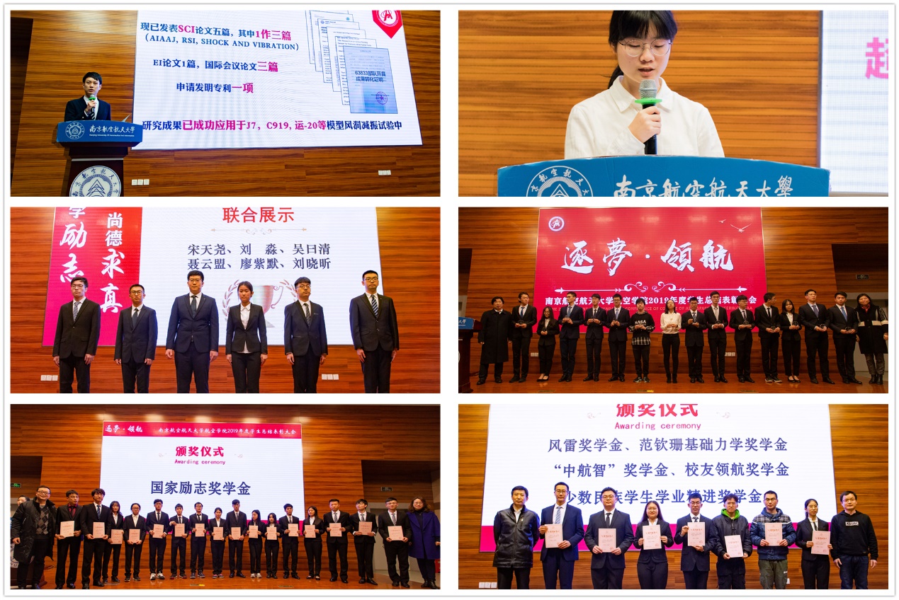 航空青年要求真,修身立德,明辨是非,匠心逐梦;要励志,学深悟透,真信笃行,扬帆领航。国家奖学金获得者、2017级研究生戴雨可分享了自己的科研求真之路,年度特别嘉奖之笃学奖获得者聂连瑞则介绍了自己小女子、大担当的成长轨迹。7名同学代表他们的团队展示了一年来参与第十五届国际老员工工程力学竞赛、SAE国际航空设计大赛、2018中国国际飞行器设计挑战赛、周培源力学竞赛、中国老员工物理学术竞赛、研究生未来飞行器大赛等国内外重量级竞赛并获得各类荣誉的事迹,以赛促学、学以致用,航空学子一直在路上。随后,大会颁发了国家奖学金、国家励志奖学金、园丁励志奖学金、少数民族员工学业精进奖学金、特别奖学金。