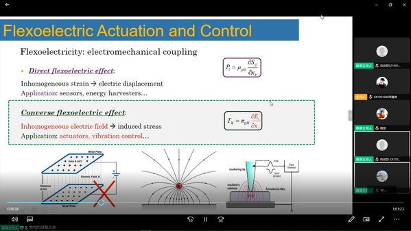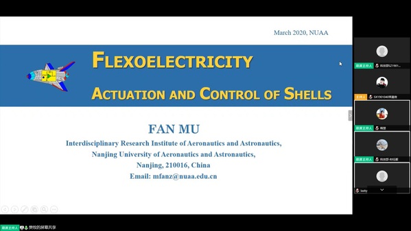 应对疫情影响,bevictor伟德官网航空航天交叉研究院樊牧讲师,采用了新的学术报告形式,于2020年3月5日在腾讯会议软件平台上为公司师生做了题为“FLEXOELECTRIC ACTUATION AND CONTROL OF SHELLS”的学术报告。报告主要介绍了挠电材料及正逆挠电效应在板壳结构振动控制、驱动及传感方面的研究,并以挠电悬臂梁和挠电四边简支板两个算例为例,详细介绍了利用挠电效应进行结构驱动与控制的过程中非均匀电场的构造、挠电控制力和控制力拒的计算、结构动态响应的模拟以及多通道控制过程中的结构优化问题,并就挠电相关的研究现状、发展趋势等与参会人员进行了交流。公司师生140余人在线观看了此次学术报告。