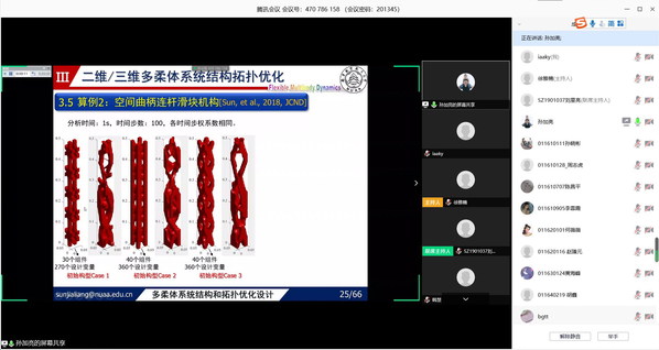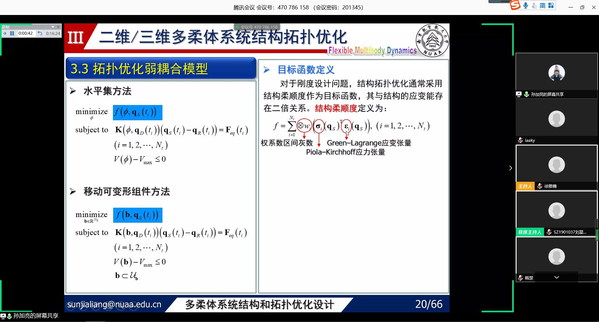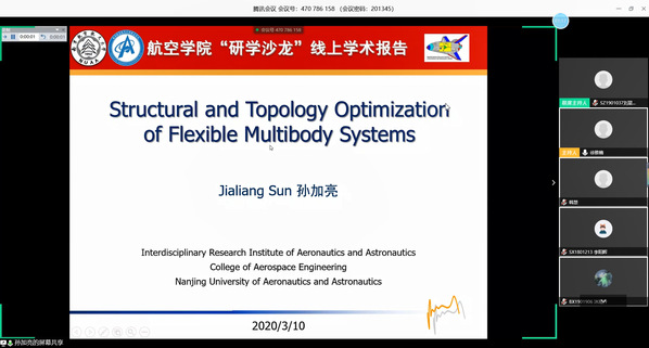 应对疫情影响,bevictor伟德官网航空航天交叉研究院孙加亮讲师,采用了新的学术报告形式,于2020年3月10日在腾讯会议软件平台上为公司师生做了题为“Structural and Topology Optimization of Flexible Multibody Systems”的学术报告。报告主要介绍了多柔体系统动力学优化设计问题,并就索网优化、静响应优化和优化全局解等与参会人员进行了交流。公司师生130余人在线观看了此次学术报告。