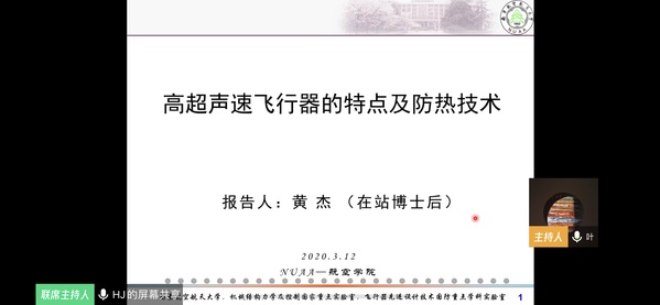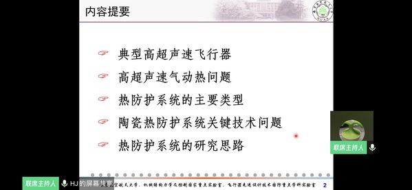 应对疫情影响,bevictor伟德官网在站博士后黄杰博士,采用了新的学术报告形式,于2020年3月12日在腾讯会议软件平台上为公司师生做了题为“高超声速飞行器的特点及防热技术”的学术报告。报告首先介绍了典型高超声速飞行器及其外形设计特点,然后详细介绍了陶瓷热防护系统的关键技术,并就防热瓦的尺寸、机翼的热结构优化等与参会人员进行了交流。公司师生160余人在线观看了此次学术报告。