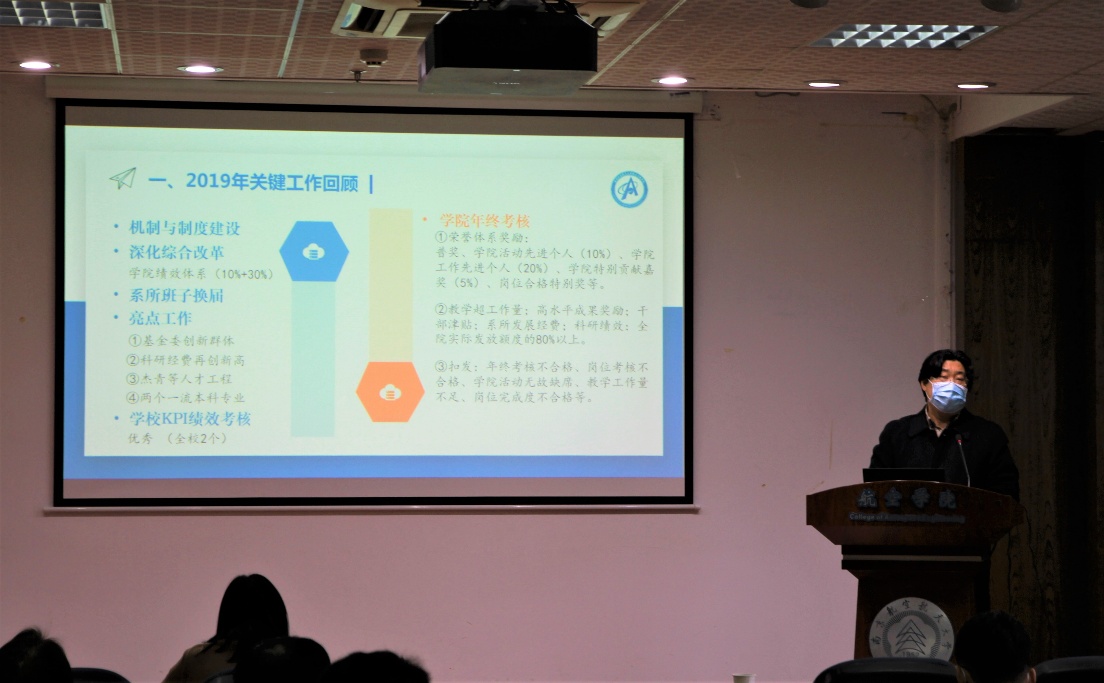 会上,经理高存法首先对2019年关键工作进行回顾总结,他说2019年全院紧跟学校的发展步伐,在各项重要工作中都取得了较好的成绩,学院再次获得考核优秀。但是,这也对学院的发展提出了更高的要求,需要我们真抓实干,才能认真完成好2020年的“答卷”。高存法结合2020年学院“抗疫情,保障教学科研等专项工作”、“深化绩效改革”、“岗位聘期考核与新一轮岗位竞聘”、“KPI考核”、“用房收费与实验仪器设备共享”五项重中之重的关键工作进行了详细解读,他强调这些关键工作都是学经理远发展绕不开的问题,需要我们深化治理,全力以赴。