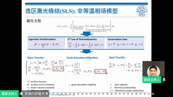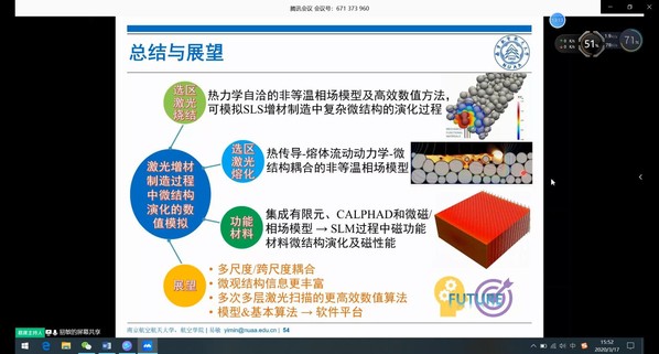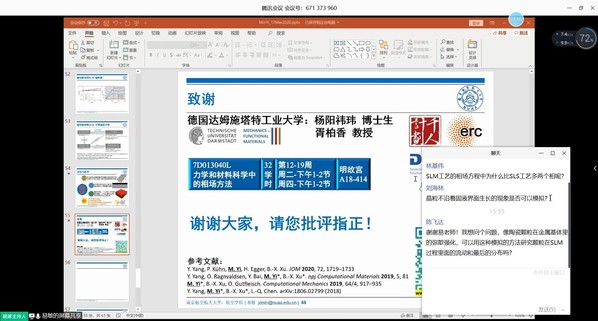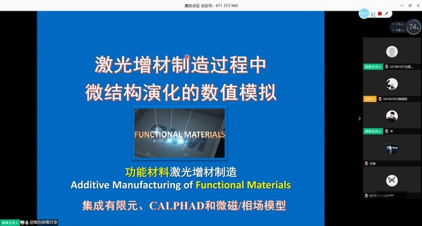 报告首先介绍了增材制造技术,以及数值模拟驱动增材制造设计的重要性,然后详细介绍了其本人及合作者近期在选区激光烧结(SLS)和选区激光熔化(SLM)非等温相场模型及数值计算方面的工作,以及磁功能材料SLM增材制造数值模拟的初步探索,并就SLM和SLS工艺的相场模型特点、陶瓷颗粒在SLM金属基体里的流动和分布、界面效应、自适应网格技术、激光增材制造中热开裂等议题与参会人员进行了交流。公司师生100余人在线观看了此次学术报告。
