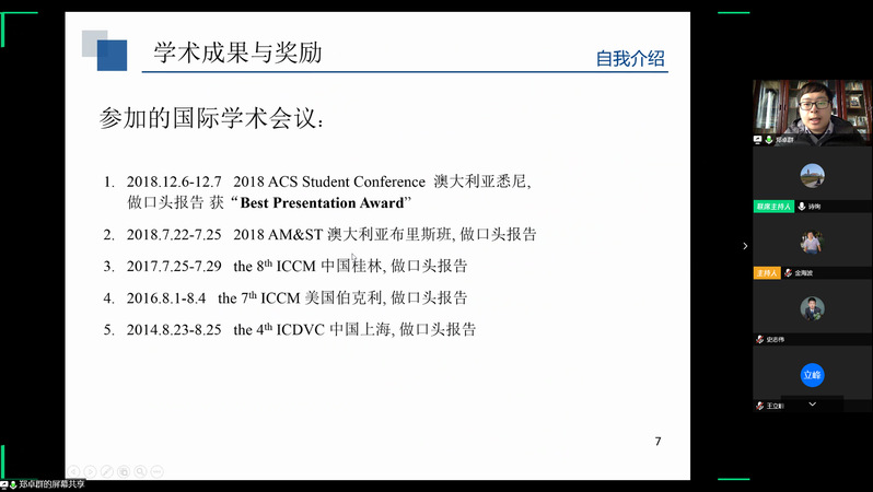 参与本次面试的青年学者,通过共享屏幕的方式,使用课件进行了自我介绍、课程试讲,并在线回答专家问题。