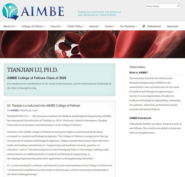 美国医学与生物工程院(AIMBE, American Institute for Medical and Biological Engineering)成立于1991年,总部位于美国首都华盛顿,是国际医学与生物工程领域著名的非盈利学术组织。AIMBE以搭建工程科学与生命科学及医学的桥梁为使命,汇聚了世界医学与生物工程领域的精英,代表了最具创新和特色的医学与生物工程领域学者和工程师,他们对医疗器械、生物材料、疾病治疗以及相关公共卫生事业的发展和政策制定具有重要的影响,先后推动成立了美国国立卫生署(NIH)和生物医学影像与生物工程国家研究院(NIBIB),共同致力于实现AIMBE的愿景:为全人类提供医学和生物工程创新。美国医学与生物工程院Fellow每年经过国际同行保密提名与严格评选产生,目前全球约有1500名。作为AIMBE中坚力量,当选者代表着在医学与生物工程界取得杰出成就(Top 2%)的学者和工程师。
