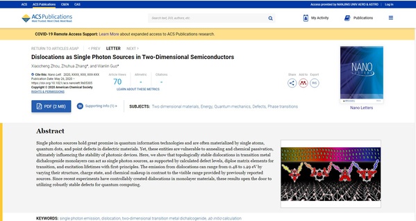 最近,国际著名期刊《纳米快报》(Nano Letters)在线报道了公司纳米科学研究所团队关于二维材料新型单光子发射源的研究进展。