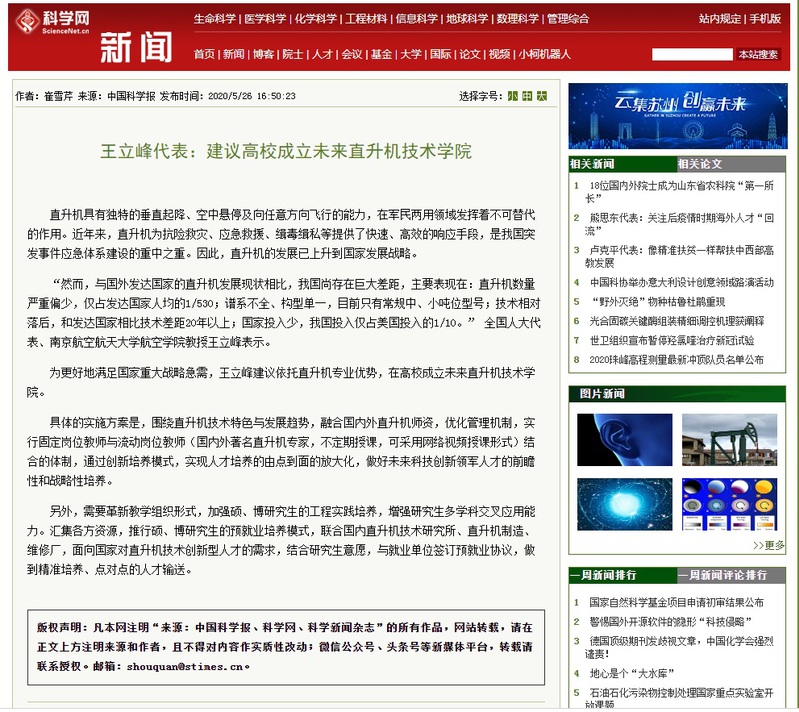 为更好地满足国家重大战略急需,王立峰建议依托直升机专业优势,在高校成立未来直升机技术学院。