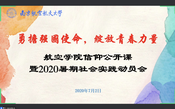 然后,韩楚向员工介绍今年社会实践的基本形式,“根据今年的特殊情况,校团委提出以线上为主,线下为辅的实践方式,并且允许员工跨学院,甚至跨学校进行组队。”更加合理的实践方式,最大程度保职工开展社会实践活动的自由度,同时重点把关各类实践行为的严谨性与安全性,是学校在开展本次暑期社会实践活动的关注点。同时,她还提到,本次社会实践方案中给出了“6+6”主题类别,即6个主题分类,分别是——“新时代国情”、“脱贫攻坚”、“建党100周年”、“志愿服务”、“共抗疫情”、“创新创业”;以及6个专项活动,分别是——“党旗在实践中闪光”、“启航行动”、“先锋计划”、“青春如此多彩”、“淬炼红心”、“一个也不能少”。在提到“新时代国情“主题类别时,她建议,同学们可以通过开展线上调研访谈,制作宣传片、记录片来响应新时代的号召,而有条件的同学可以深入当地城镇、乡村及企事业单位进行参观考察和学习体验。通过实地调研,员工可以更直观地体会行业发展的现状,包括航空航天领域,亲身体验中国发展的速度。