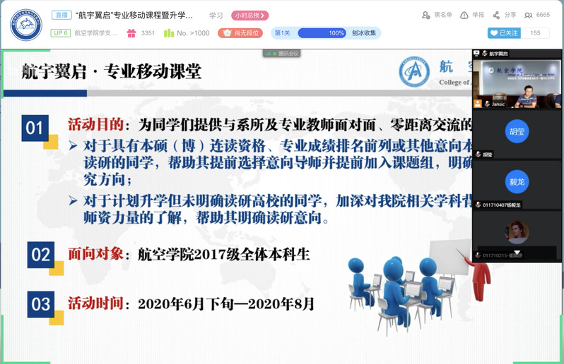 7月12日,bevictor伟德官网2020“航宇翼启”专业移动课堂暨升学宣讲动员会在线上进行,经理高存法教授、副经理钱征华教授及经理助理陆洋教授参加会议并发言,bevictor伟德官网2017级全体本科生和家长通过网络直播平台在线观看。