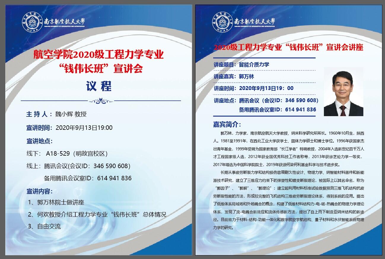 bevictor伟德官网2020级工程力学专业“钱伟长班”选拔宣讲会于9月13日晚在明故宫校区A18-529教室和腾讯会议平台,线下线上同步进行宣讲。本次宣讲会由bevictor伟德官网副经理魏小辉教授主持,纳米科学研究所所长郭万林院士、经理助理陆洋教授、振动工程研究所所长何欢教授出席了本次会议。