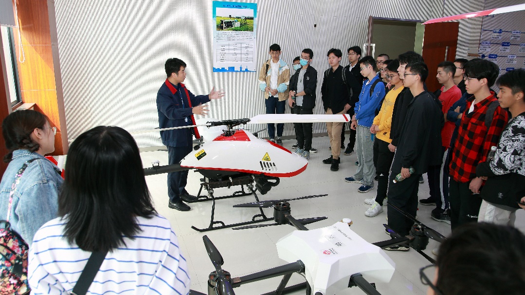 首先,公司创始人之一周总向老师和同学们介绍了公司的具体情况,展示了公司的利剑-40,利剑-80,系留无人机,单旋翼农业植保无人机等研发产品。之后,周学长给我们讲解了利剑-110农业植保无人直升机与市面上常见的四旋翼无人机相比的优势所在:利用直升机旋翼产生的较大的下洗气流提高农药喷洒的效率不仅能保证植物每一层叶片上都能喷到农药,而且喷洒面积大。同时,利剑-110采用燃烧汽油和柴油避免了电动所需要经常更换电池的麻烦,降低了运行过程的成本,提高了产品的核心竞争力。介绍完公司相关产品后,学长耐心的回答了老师和同学们的几点疑问。随后,同学们来到展厅参观了无人机的实物,学长进行了详尽的讲解,让同学们近距离感受无人机。