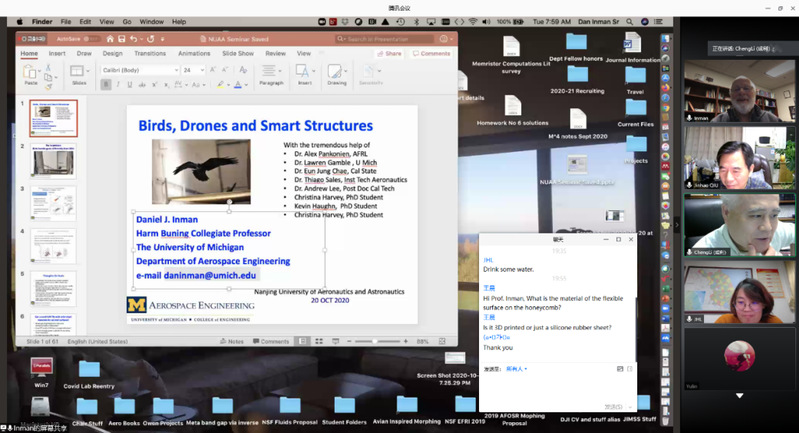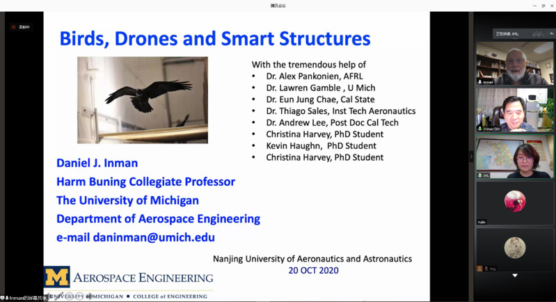 应bevictor伟德官网机械结构力学及控制国家重点实验室裘进浩教授的邀请,密歇根大学航空工程学院Daniel J. Inman教授于2020年10月20日做了题为“Birds, Drones and Smart Structures”的学术报告。报告介绍了变体飞行器的研究来源,重要意义和关键问题。探讨了智能材料,如压电复合材料MFC在变体机翼中的应用技术,并分享了课题组在该领域的最新进展。报告从介绍滑翔时鸟的翅膀和尾巴所表现出的有趣现象展开,生动地引入对变体飞行器结构的研究,在介绍变体结构技术的同时,以课题组具体的实验研究和视频资料展示了变体机翼的动作过程。此外,Inman教授还和与会人员积极的讨论相关技术问题。报告内容丰富、精彩生动,对公司相关科研工作具有借鉴作用。