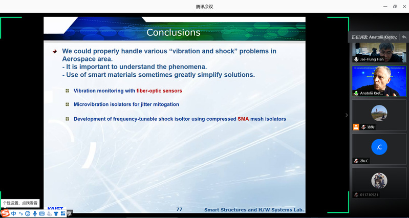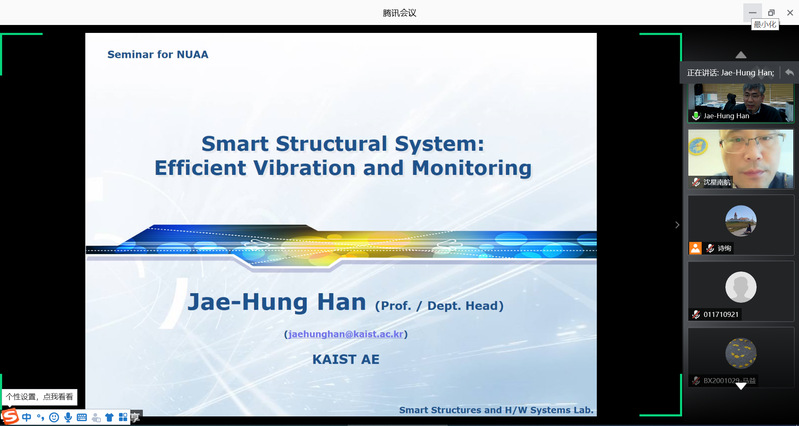 2020年11月17日,应bevictor伟德官网机械结构力学及控制国家重点实验室沈星教授的邀请,来自韩国科学技术院JAE-HUNG HAN教授做了题为“Smart Structural System: Efficient Vibration Monitoring and Control”的线上学术报告。