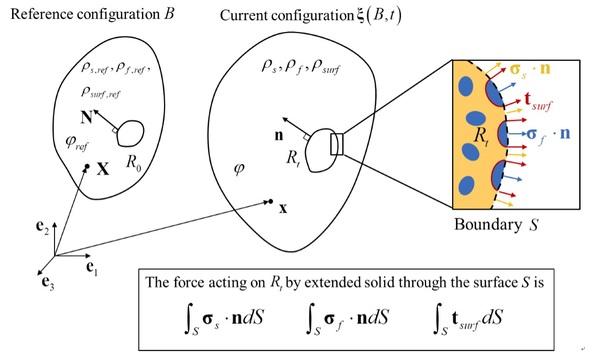 回顾20世纪以来多孔介质力学和表面力学的发展,发现针对多孔介质中的表面效应的理论研究极具挑战性。首先,只有在已知表面形状的情况下才能计算表面应力,但多孔介质中的固-液界面很难精确描述。其次,多孔介质力学需要研究三维空间中的力平衡,而表面力学考虑的力平衡本质上是二维空间中的平衡。因此,从表面力学出发建立包含表面效应的含液多孔介质通用理论,成为多孔弹性理论研究的难点。