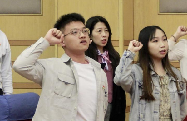 党课后,由优秀毕业生党员代表2021届硕士毕业生石启鹏 ,新党员代表2017级本科生王晓一领誓,在场百余名新党员进行入党宣誓、毕业生党员重温入党誓词。