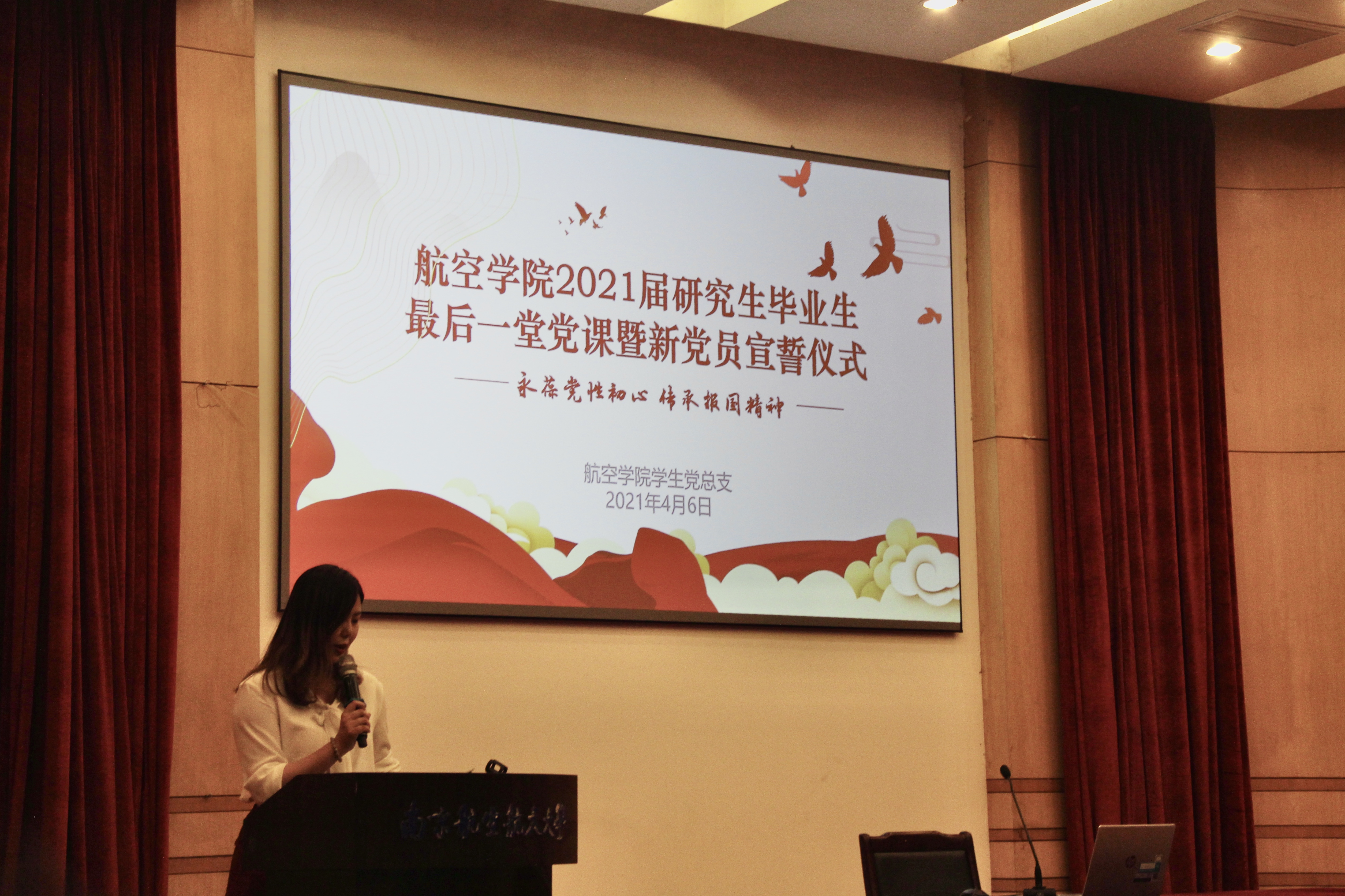 4月落英缤纷,2021届硕士毕业生同学将行囊备好奔赴祖国五湖四海,开启新的人生征途,助力国家航空事业的发展。最后一堂党课寓意深远,鼓励所有毕业生党员带着党性初心再次出发,脚踏实地做好本职工作,传承南航的报国精神,谱写和祖国共出彩的精彩篇章。