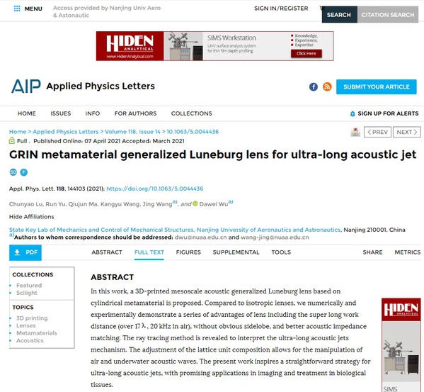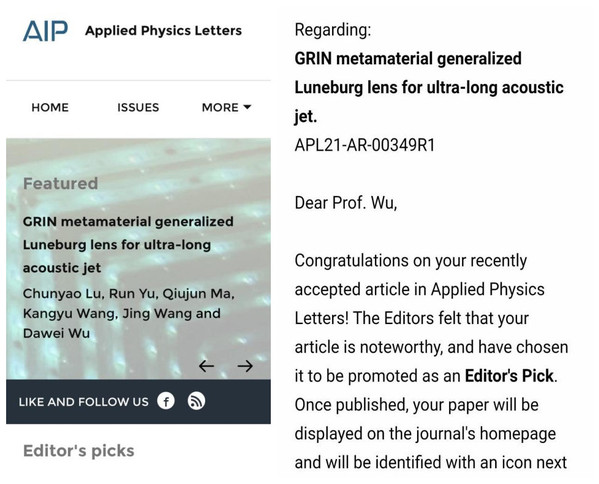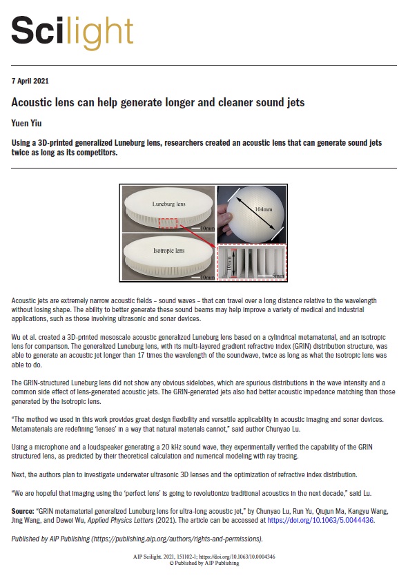 bevictor伟德官网卢春尧等硕士生在声学超材料声透镜研究方面取得重要进展,相关成果“GRIN metamaterial generalized Luneburg lens for ultra-long acoustic jet”近日发表于美国物理联合会(AIP)旗舰期刊Applied Physics Letters,并被选为 “Editor’s Pick”和“Featured Article”,同时AIP Scilight以“Acoustic lens can help generate longer and cleaner sound jet”为题进行了采访报道。