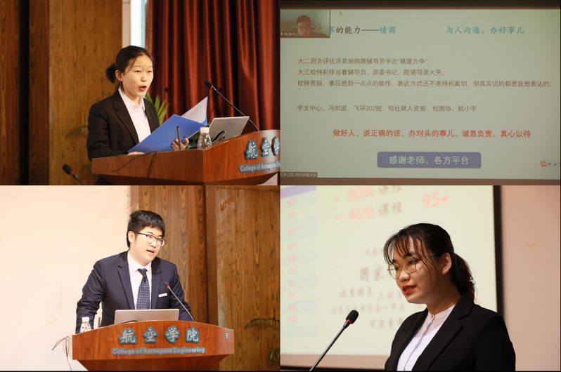 刘鎏同学分享了自己纵横驰骋的大学之路,感谢在母校南航的所遇、所学。聂连瑞同学分享了自己在南航这块土地上的茁壮成长。焦重熙同学分享了自己在专业水平和科创竞赛领域的突出成就。汪乘雲同学分享了探索自己热爱并感兴趣领域的心路历程。李敉宁同学从学业、竞赛、科创、实践等多方面介绍了自己为学术、为理想、为热爱的多彩老员工活。潘洋同学介绍了自己作为班长、辅导员助理的责任与担当,表达了对母校的感谢。