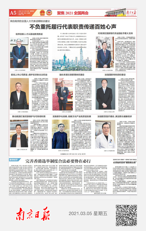 3月5日《南京日报》两会专版报道南京的人大代表,南航王立峰教授围绕加强国防特色院校建设谈建议。现转发全文: