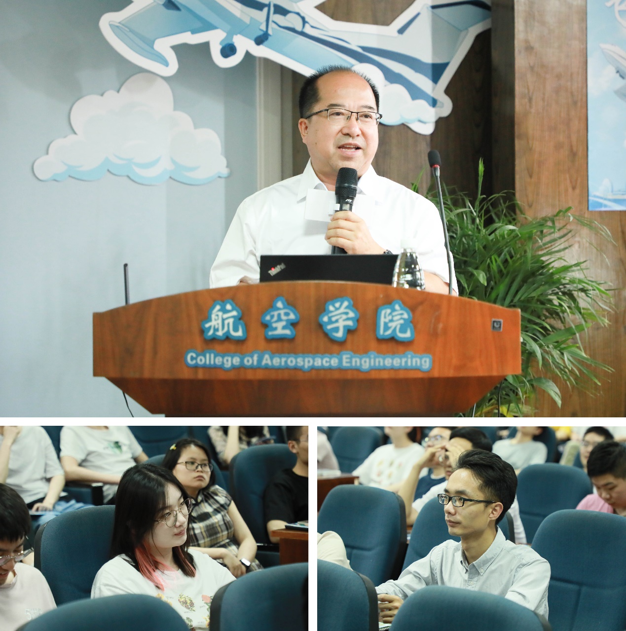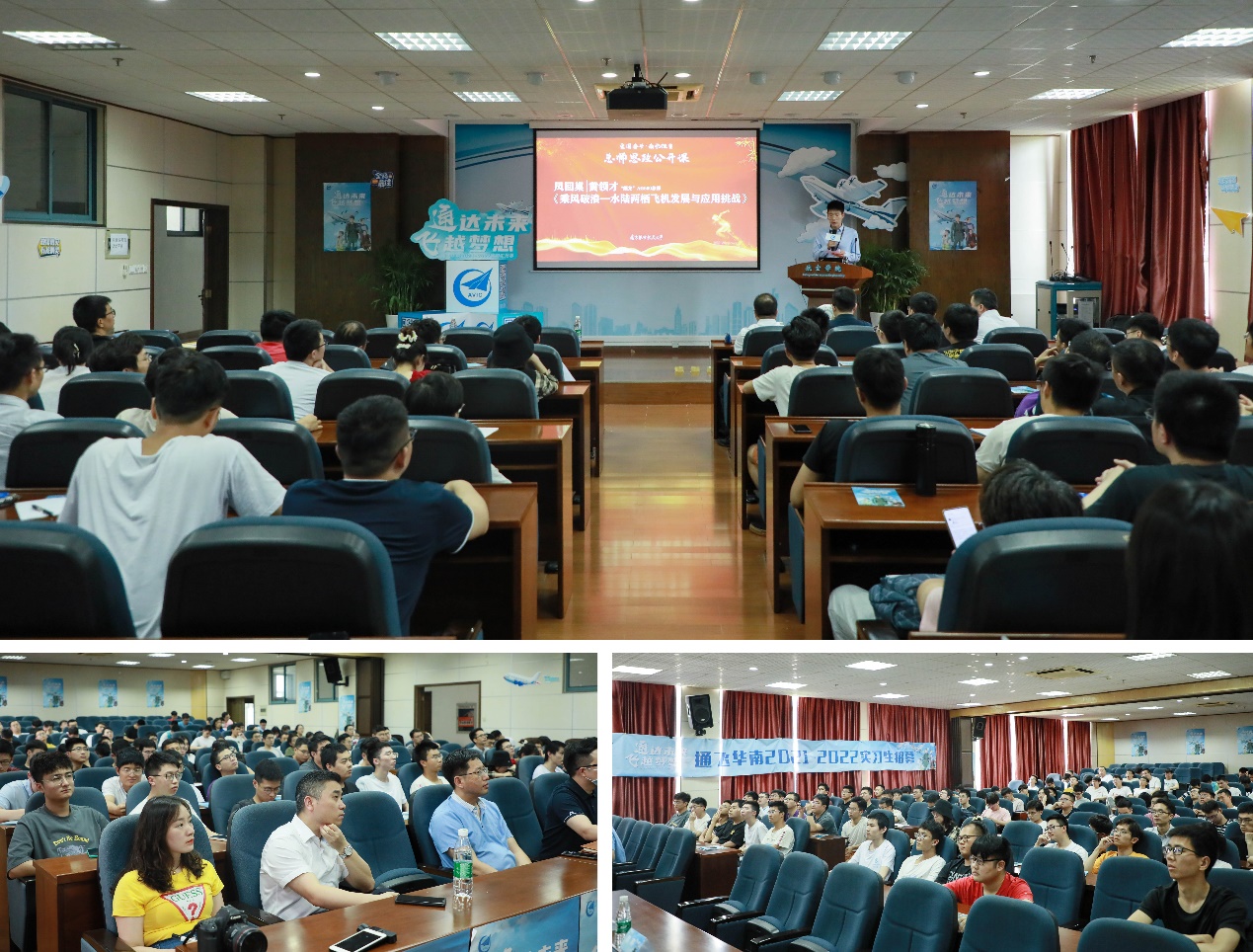 黄领才详细介绍了各类型飞机的发展历史,重点介绍了新中国航空工业的发展历程和重点飞机型号的研制经历。随后,黄领才围绕我国新一代水陆两栖飞机AG600的设计研制经历,从该项目的研制背景、使用模式及应用前景、研制进展、技术特点、研制的意义、设计师的责任等六个方面全面介绍了AG600,讲述了担当型号研制重任三千多个日日夜夜的爱国奋斗故事。同时,他结合下一阶段AG600的改进工作,详细介绍了目前各参研部门着力开展科研攻关的研究方向,以及目前中航通飞华南在人才队伍建设方面的一些设想与规划。最后,黄领才总师结合自己在航空产品研发领域辛勤耕耘30余年的人生经历感悟,勉励航空学子牢记使命责任,发扬航空报国精神,继续为实现新时代航空强国建设的目标而奋斗。