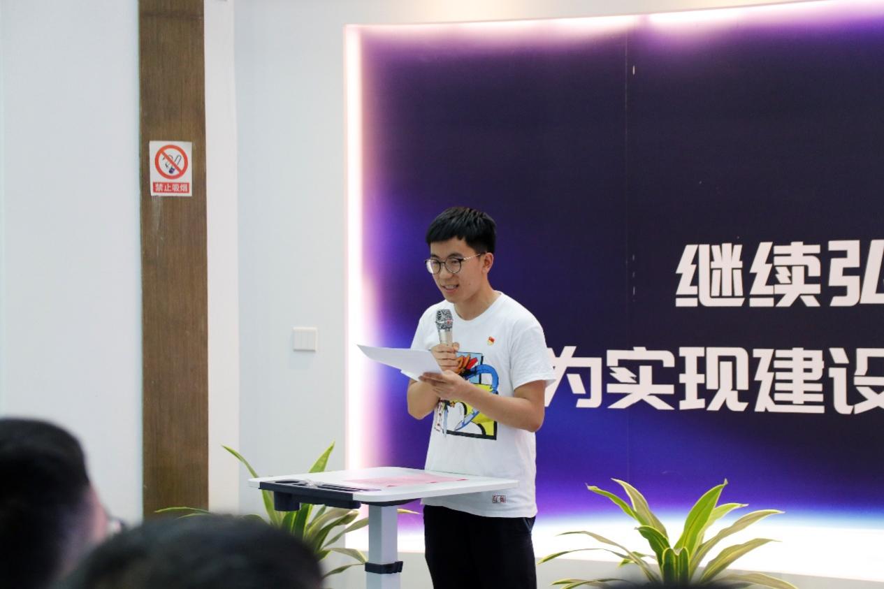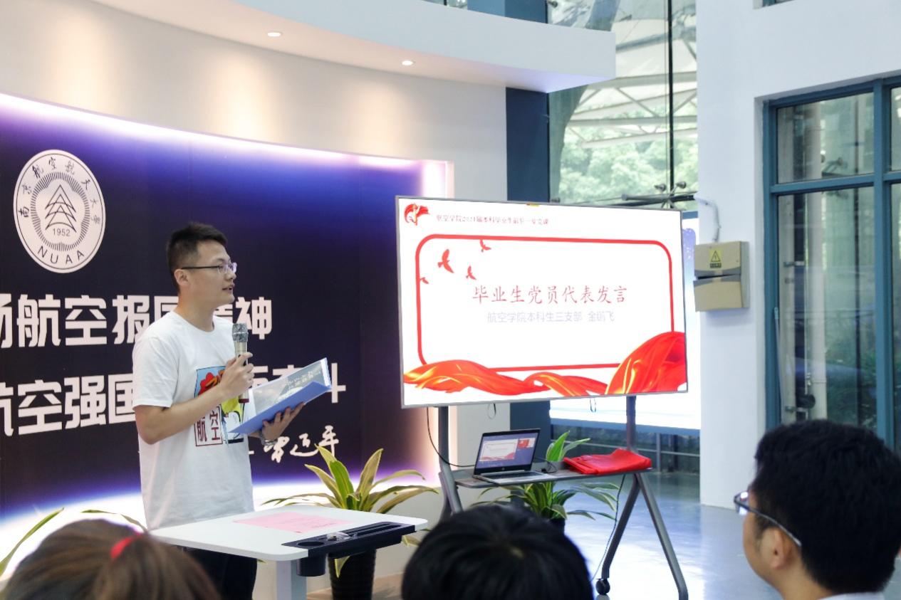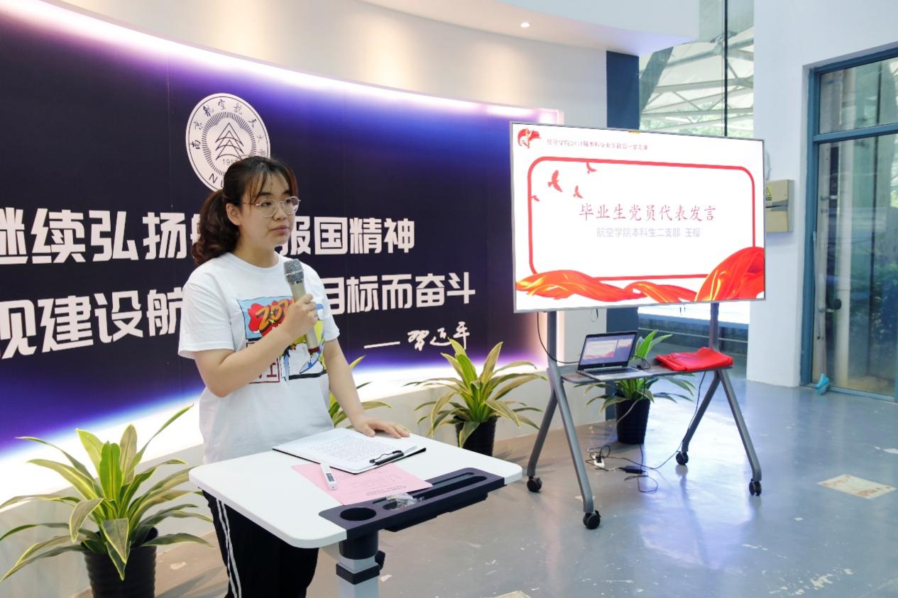本科生二支部王樱、本科生三支部金鹏飞分别作为毕业生党员代表发言。王樱作为2017级本科生第一批党员,讲述了自己对党组织的情感从迷茫到坚定,从懵懂到敬爱的经历,并表示党员身份始终激励着她一直向前保持努力,科创竞赛勇创佳绩、志愿服务帮助他人,毕业即将在本校读博,将不贪图享乐、敢挑战自我,为中国航空事业发展尽一份力。