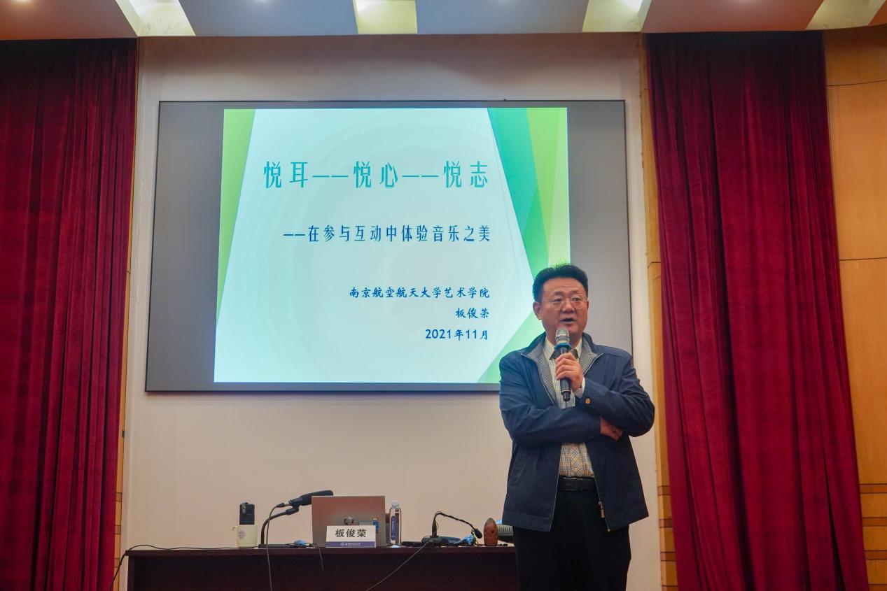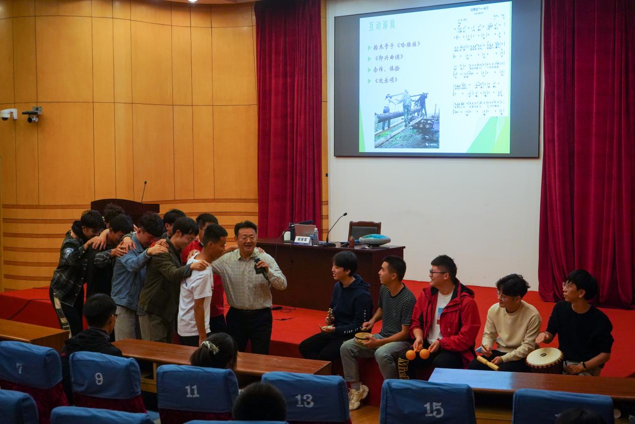 培训日下午,艺术学院经理板俊荣继续带来精彩讲授,他以《悦耳——悦心——悦志(基于实践,践行美育)》为主题,通过丰富的视频资料、稀奇罕见的小乐器、有趣的模仿动作,以多种多样的形式充分调动同学们参与,鼓励同学们以“主动体验”的方式体会音乐的乐趣所在,现场热烈气氛达到高潮。