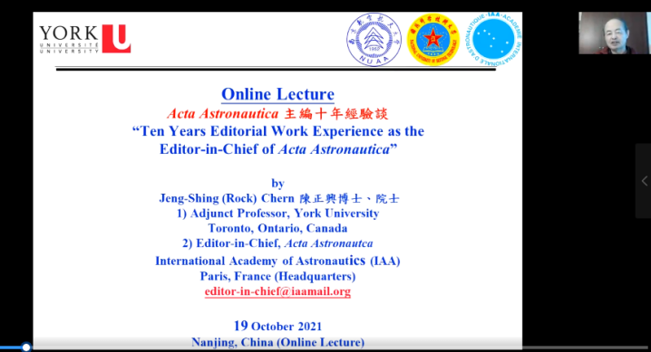 随后,针对写作后如何发表在高水平期刊以及投稿过程中可能出现的问题,团队邀请Acta Astronautica(国际宇航学报)主编、国际宇航科学院院士、加拿大约克大学机械工程系Rock Jengshing Chern教授在线上做了题为“Ten Years Editorial Work Experience as the Editor-in-Chief of Acta Astronautica(Acta Astronautica 主编十年经验谈)”的学术报告。Chern教授介绍了主讲人从事Acta Astronautica主编11年的经历,漫谈处理过程之经验,以及投稿到Acta Astronautica一般注意事项。报告分为经验案例、Acta Astronautica历史、Acta Astronautica现状以及主讲人在Acta Astronautica的编辑经验与感想。两位教授在报告时结合自己多年的研究经历,与现场听众分享了研究心得和体会。报告结束后,两位教授还与包括金栋平教授、王在华教授、陈提教授等在内的与会老师、员工积极地交流了英文技术性论文撰写和发表过程中的常见问题。通过该科研学习活动,对提高团队师生学术论文的撰写质量和促进团队师生发表高水平期刊论文起到了积极的作用。