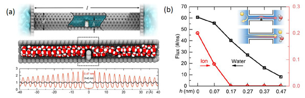 图2. (a) 一维受限水在局部扰动下轴向密度产生类弗里德尔振荡。(b) 一维受限水的类弗里德尔振荡导致离子阻塞行为。