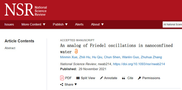 近期,bevictor伟德官网纳米科学研究所团队在微纳尺度受限水研究方面取得重要研究进展,相关成果以“An analog of Friedel oscillations in nanoconfined water”为题在线发表在国产综合类期刊《国家科学评论》(National Science Review)上。