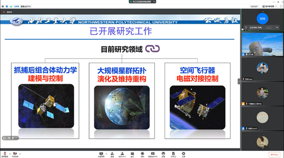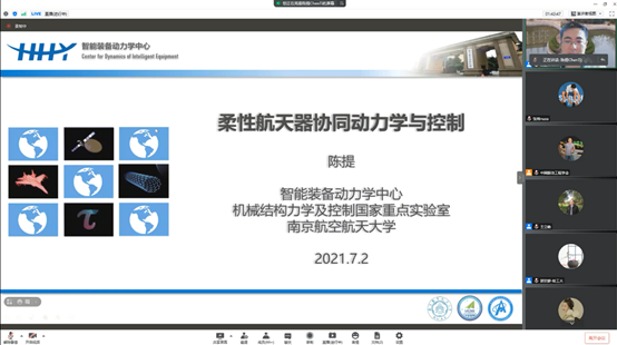 自由讨论期间,北京邮电大学贾世平、清华大学刘金玉、中山大学史格非、西北工业大学刘闯、南京理工大学庞兆君分别就“柔性航天器与空间机械臂运动与主动振动控制研究”、“柔性电动力绳网木卫附着动力学与优化控制研究”、“空间系留电梯技术研究”、“面向在轨服务的动力学与控制”和“面向空间碎片主动清除的柔性飞网动力学研究”做了研究工作交流。最后,多位青年学者针对航天器结构振动控制、智能学习方法、柔性航天器动力学与控制、空间机械臂及绳系卫星动力学与控制等进行了深入的讨论。
