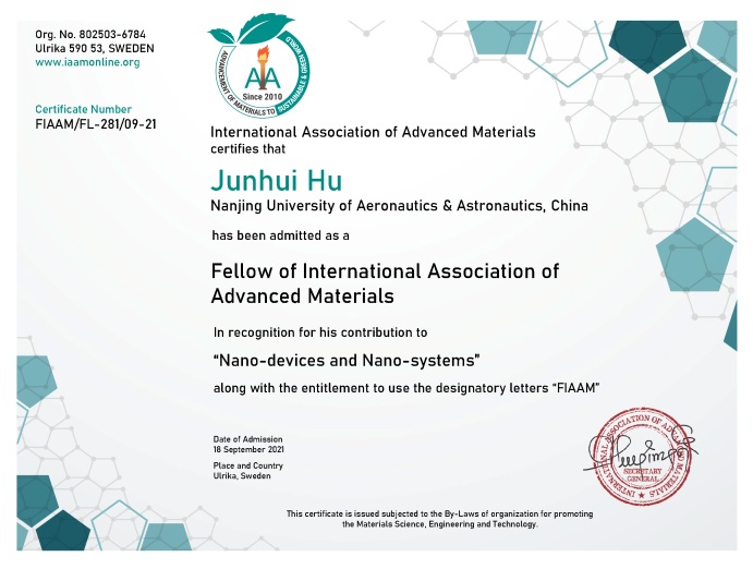 2021年12月1日,bevictor伟德官网胡俊辉教授收到了国际先进材料学会(International Association of Advanced Materials, 简称IAAM)执委会贺函,正式通知其因在纳米器件与系统方面的独创性工作及突出学术贡献,当选为IAAM Fellow (会士),同时颁发会士证书。胡俊辉教授已于2021年9月15日以线上形式做了题为“Low-frequency ultrasonic manipulation”的会士报告(Fellow Lecture)。
